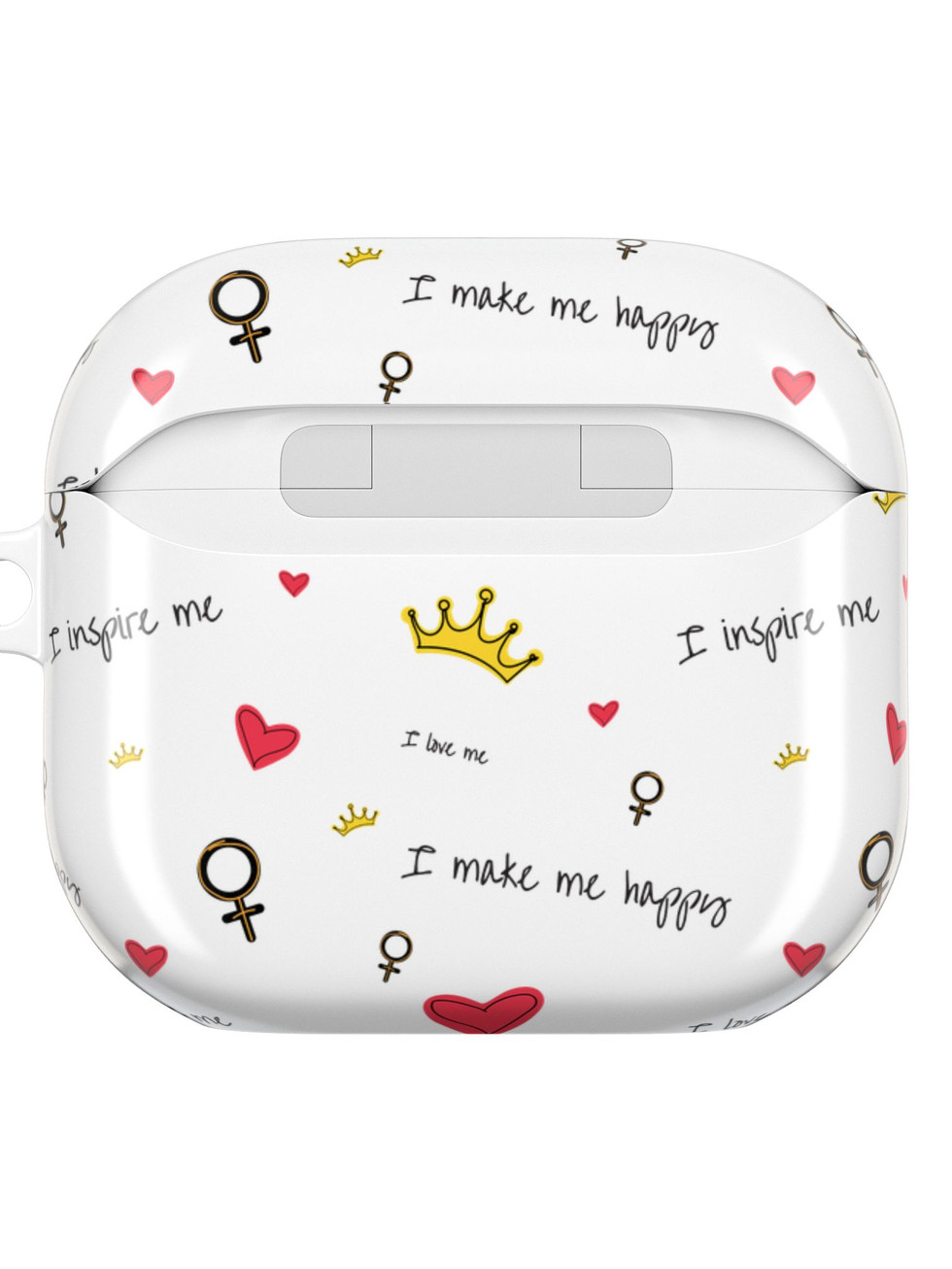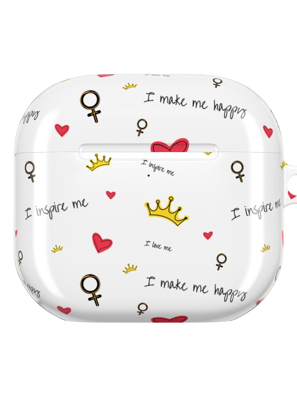 A glossy, pocket-ready AirPod case that brings a little joy to everyday moments. The slim polycarbonate shell wears a playful print of tiny crowns, hearts, and female symbols alongside handwritten affirmations like “I make me happy” and “I inspire me.” It snaps on securely to shield your charging case from dings and scratches while keeping the charging port fully accessible. Lightweight and smooth to the touch, it includes a carabiner so you can clip your case to a bag or belt loop and carry that quiet boost of confidence wherever you go. Made in South Korea with durable, impact-resistant materials and a bright gloss finish, this case moves with you — from crowded commutes to weekend coffee runs — with charm and resilience.
