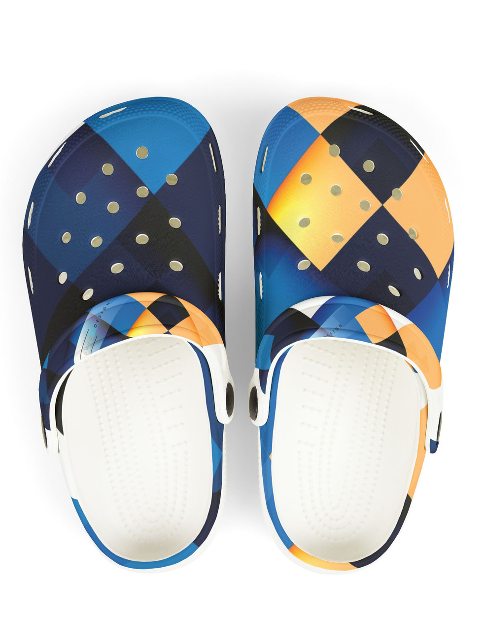 Bright, playful clogs designed for active kids who love color and easy wear. Lightweight 100% EVA construction gives a springy, cushioned feel while the contoured footbed hugs little feet for all-day exploring. The bold blue, navy and golden-amber argyle-inspired print adds cheerful energy to backyard adventures, beach days, or quick errands with family. A pivoting heel strap keeps them secure during running and play, and the ventilated upper lets feet breathe. Each pair arrives with fun clog charms to personalize and swap — a small detail that sparks joy and makes these clogs feel truly theirs.
